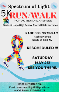 Announcements Spectrum 5K May 25 submitted May 2, 2024 HOPE – Light Up the Spectrum 5K: Racing for Autism Awareness has been rescheduled to Saturday, May 25th. We hope to see you there. Packet pick-up begins at 6:30 am with the race starting at 7:30!