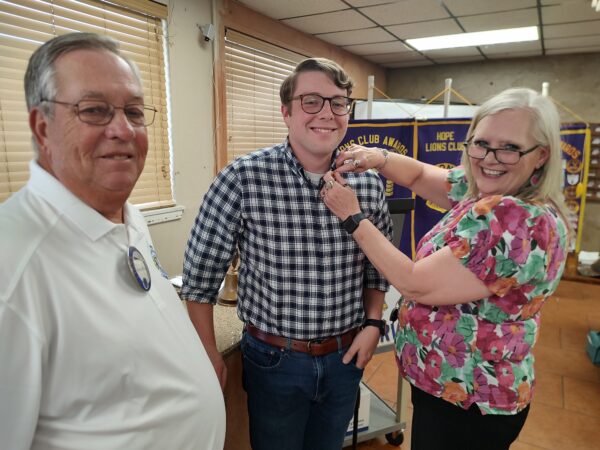 The Hope Lions Club installed Bryce Montgomery as the newest Hope Lion on Monday. Montgomery is an attorney in Hope. He is also a candidate for District Judge. Pinning Montgomery’s Lion pin on is Karen Smith while Lions President Steve Atchley looks on.