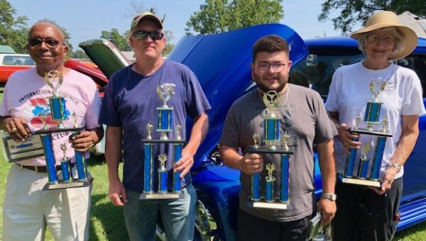 The People’s Choice Award, voted on by Civitan Car Show visitors as well as car show entrants, went to Darin Laughard of Hope for his 2015 Dodge Challenger SRT. The trophy was created and donated by Hugg & Hall Equipment. New awards went to Freaks of Nature car club for Most Club Participation and to Calvin Wright of Southside, AR, for Longest Distance Traveled to Show. Those trophies were created and donated by VMKustumz. Pictured (from left) are Civitan President Mona Still, Laughard, Richard Rush of Freaks of Nature, Civitan Car Show Chairman Amber Mackey, and Wright.