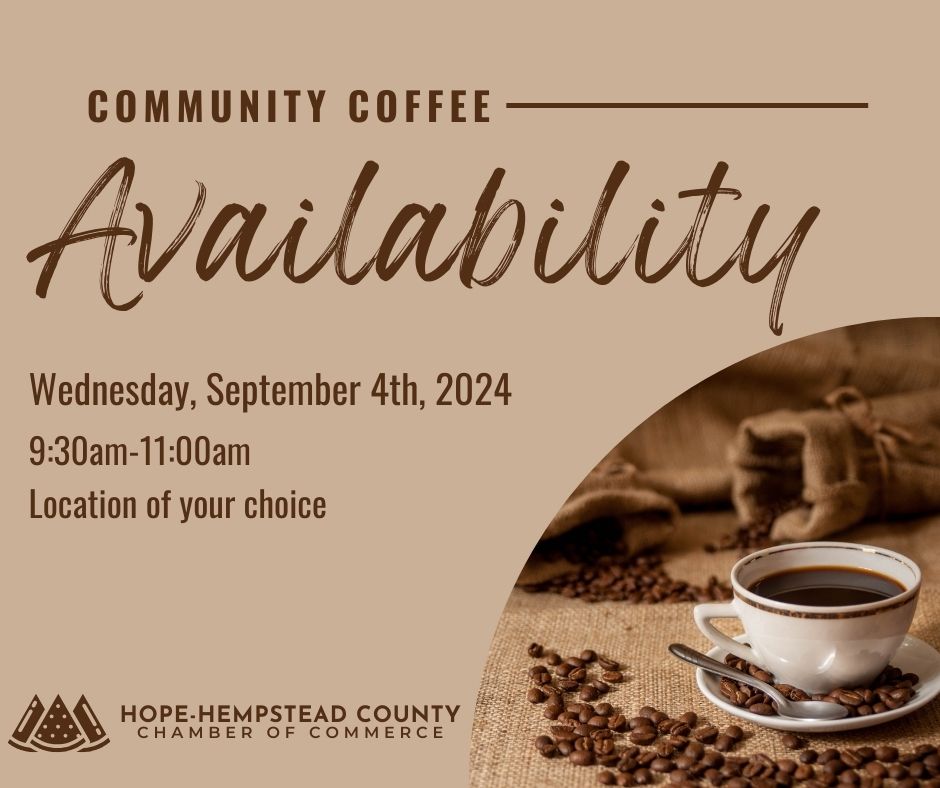 We have an available Hope-Hempstead County Community Coffee date on September 4th, 2024! If you’re a Chamber member interested in hosting, this is your chance to showcase your business and connect with our community.