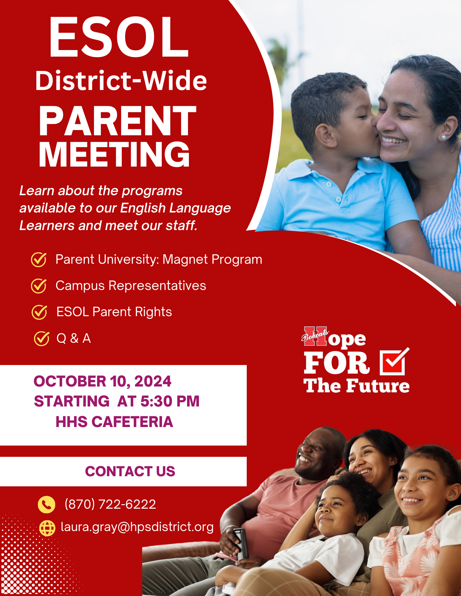 HOPE – Hope Public Schools will hold an English for Speakers of Other Languages (ESOL) District-Wide Parent Meeting on October 10th, at 5:30 pm in the Hope High School Cafeteria. Learn about the programs available to our English Language Learners and meet our staff. Learn about the Parent University: Magnet Program, ESOL Parent Rights, and speak with campus representatives. For more information, contact Laura Gray at (870) 722-6222 or laura.gray@hpsdistrict.org.