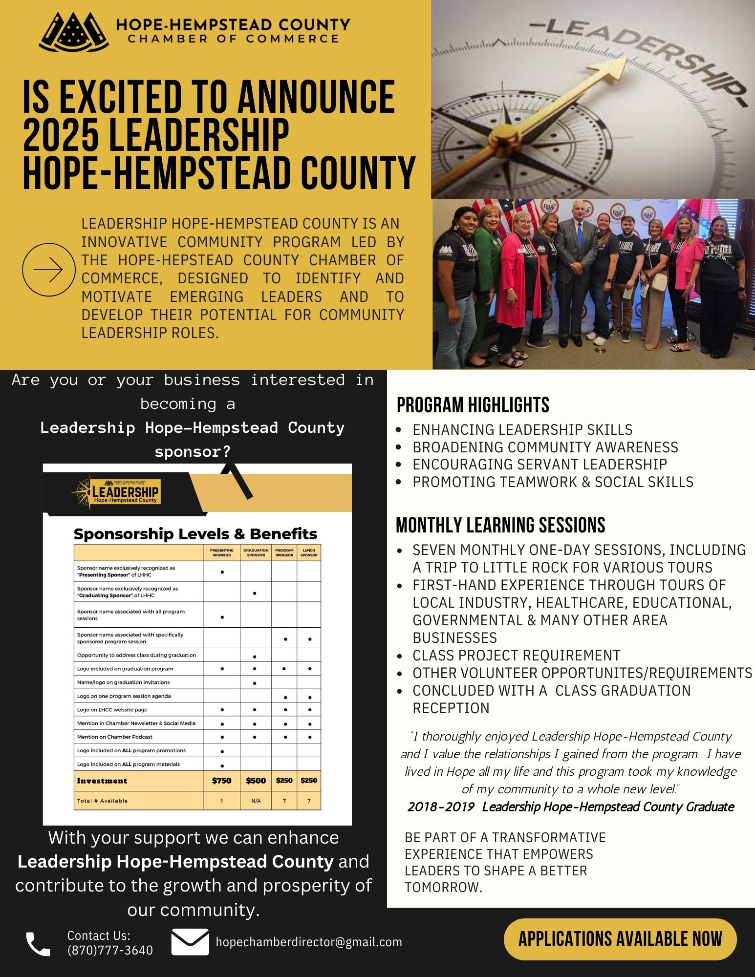 Leadership Hope-Hempstead County is governed by the Hope-Hempstead County Chamber of Commerce. Applications will be reviewed and once accepted the applicant will be notified. The Hope-Hempstead County Chamber of Commerce will invoice the applicant/employer for the program fee of $400.00. We encourage employers to consider assisting with or supplying payment for this fee.