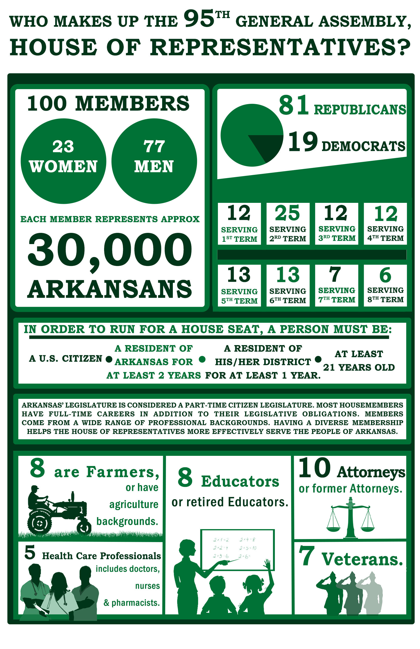In terms of professions, we have a varied group of individuals including 10 attorneys, 8 farmers, 8 educators, 5 health care professionals, 10 real estate professionals, and 4 individuals involved in ministry.