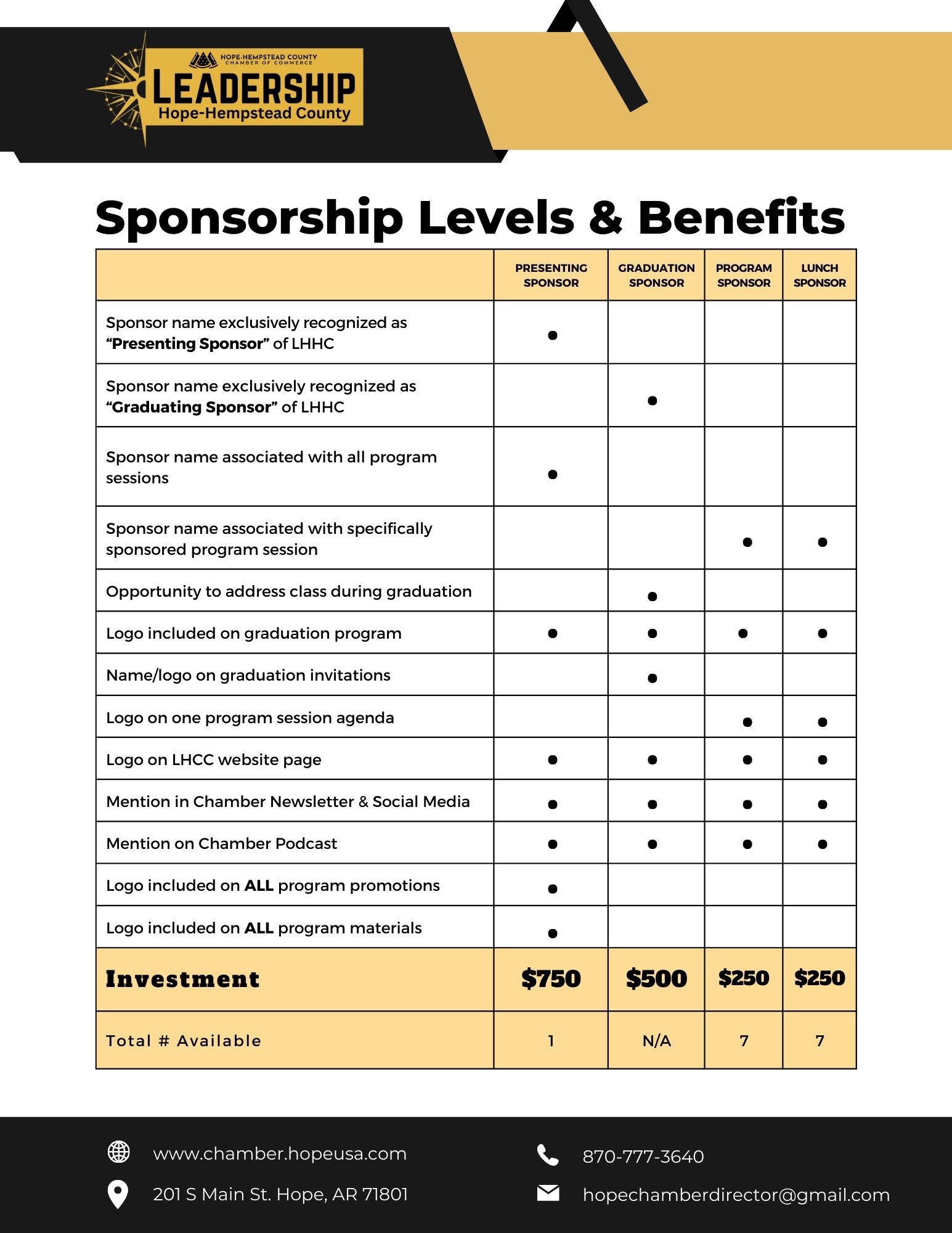 Sponsorship opportunities for Leadership Hope-Hempstead County program