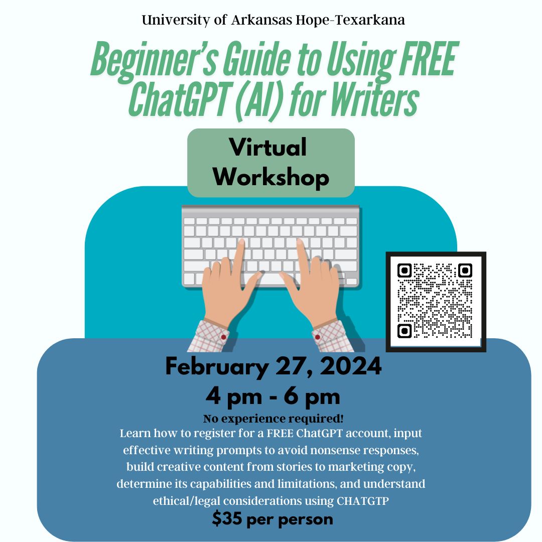 HOPE – ChatGPT (AI) is here to stay and is an integral part of the future for writers and content creators. Don’t be left behind! Sign up for the ChatGPT course at the University of Arkansas Hope-Texarkana today. No prior AI experience is required.