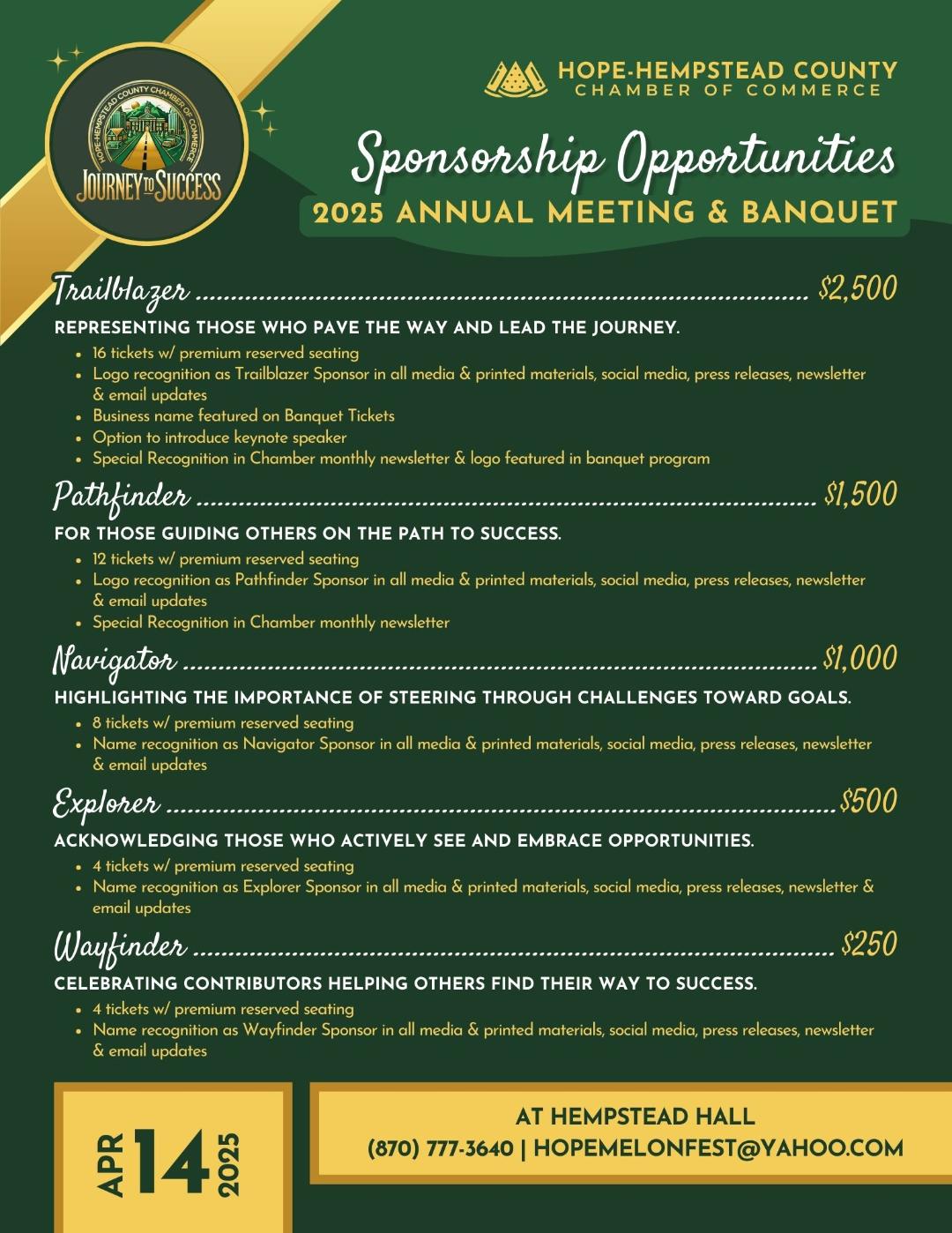 For sponsorship details, contact us at (870) 777-3640 or email hopechamberdirector@gmail.com