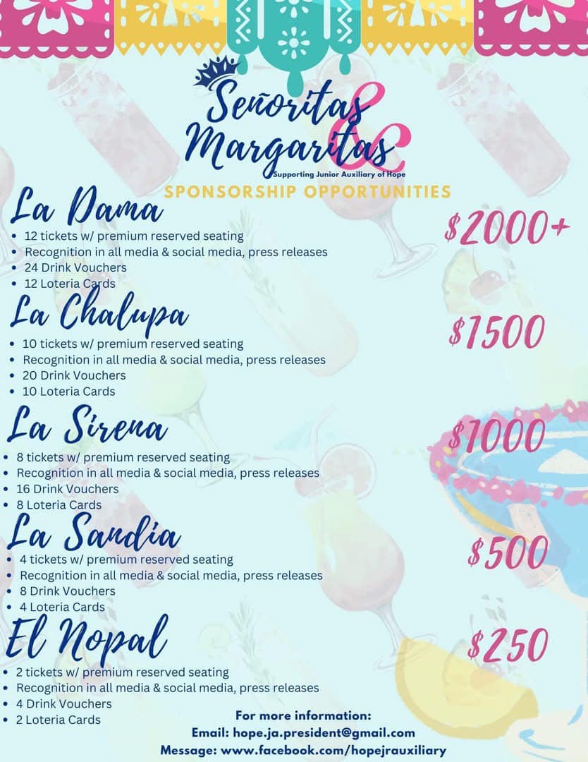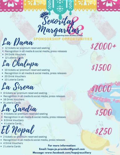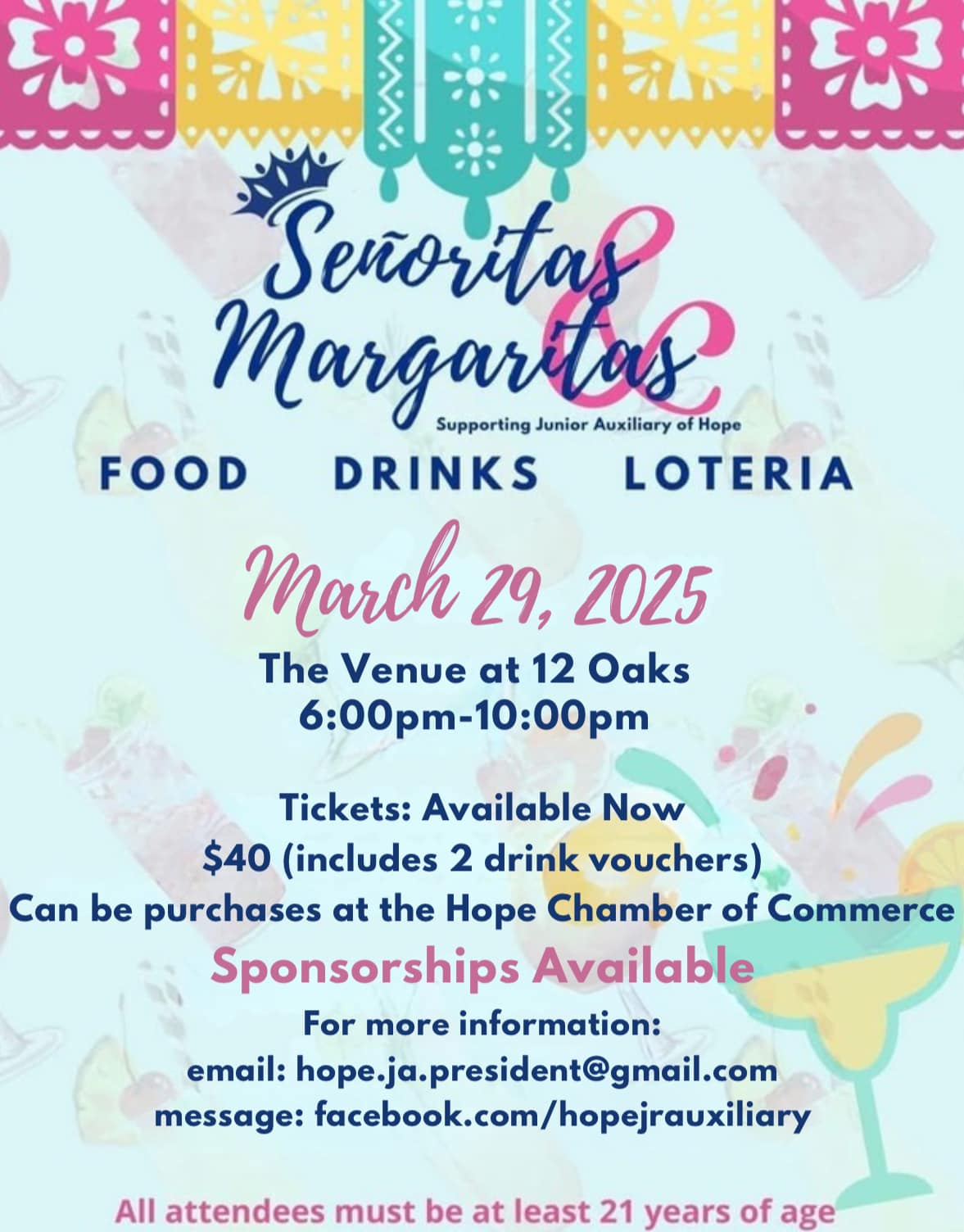 HOPE – We are excited to invite you to be a part of the Junior Auxiliary of Hope’s 3rd Annual Señoritas & Margaritas fundraiser, happening on March 29, 2025! This lively event will feature Lotería, raffles, silent auctions, delicious food, and drinks, all for a great cause.