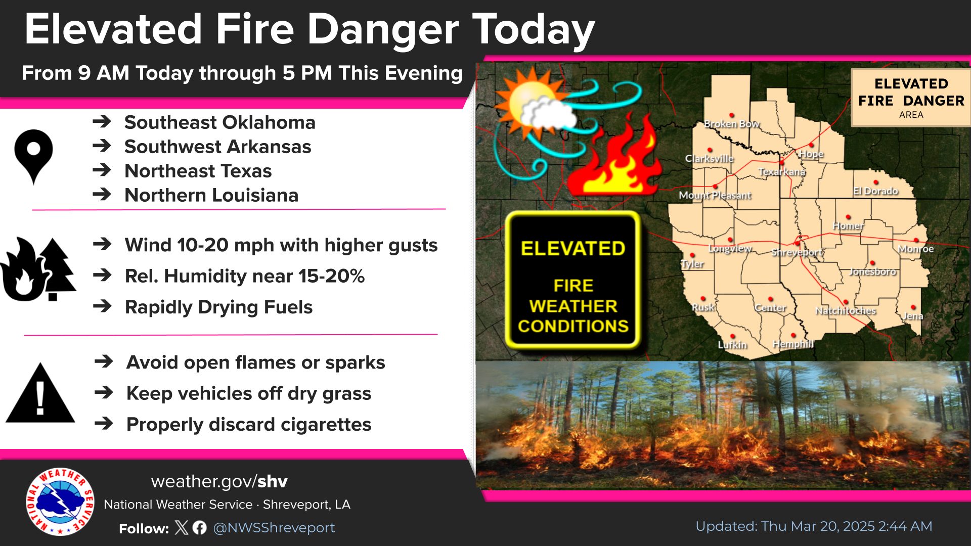 Featured Hempstead County News Nevada County News News Regional News Elevated fire danger today in Hope-Prescott Region National Weather Service-Shreveport March 20, 2025