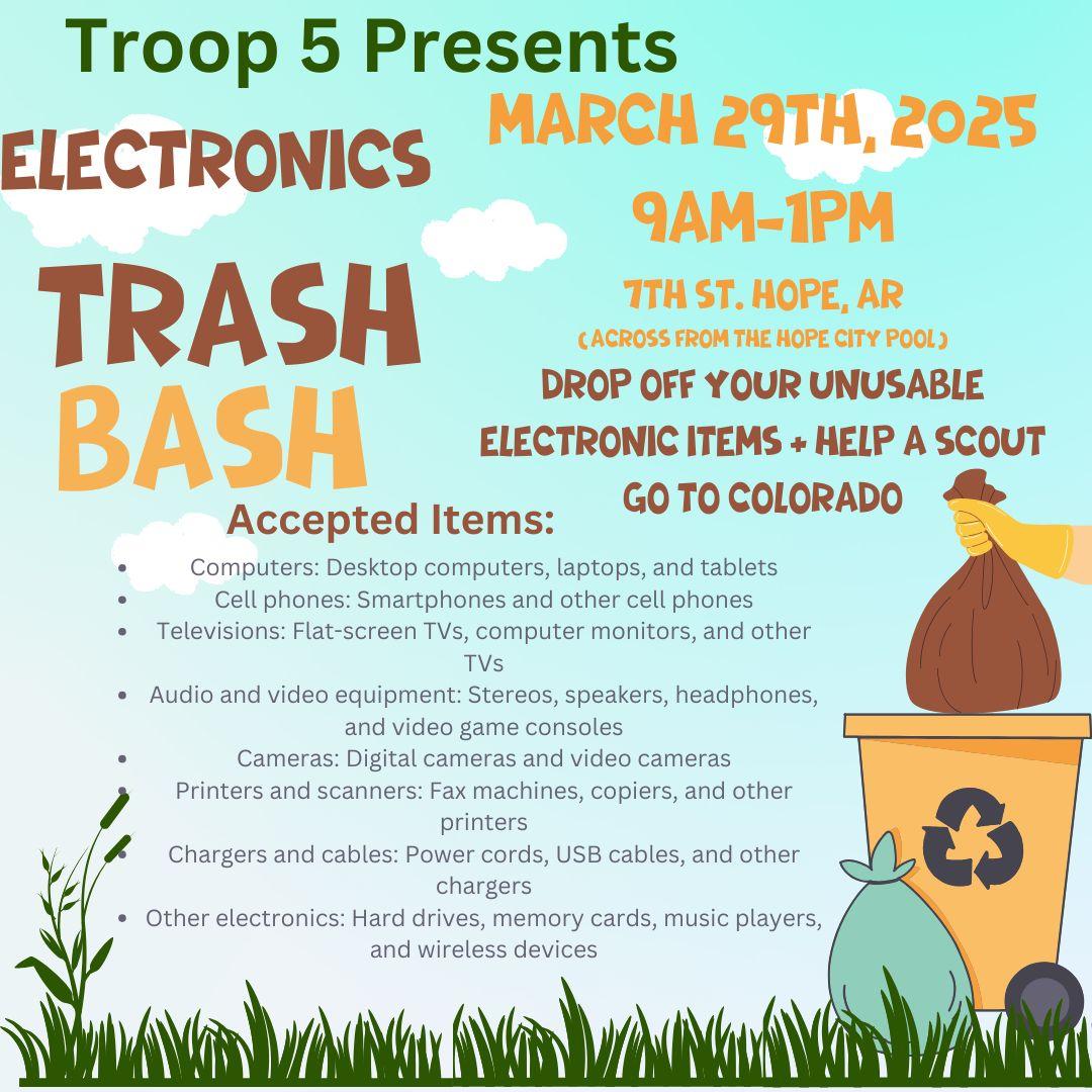 HOPE – This Saturday, March 29th, Scout Troop 5 will be presenting an electronics waste recycling event from 9am-1pm. It will be located across from the Hope City Pool on 7th St. The event will help send Scout Troop 5 to Colorado this summer. The Scouts will be grilling hot dogs and will have drinks available for sale. The following items can be recycled: