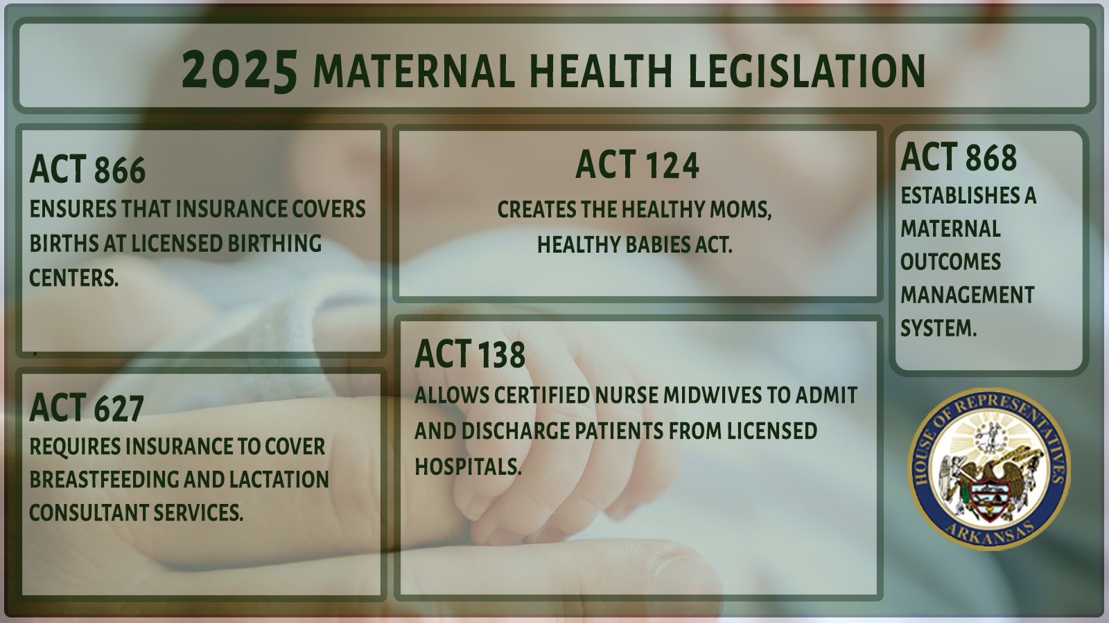 The cornerstone of our efforts is Act 124, the Healthy Moms, Healthy Babies Act. This legislation represents a $45.3 million investment in maternal and infant health. It establishes Presumptive Medicaid eligibility for pregnant women, meaning pregnant women can receive prenatal care while they complete their Medicaid application. And it establishes pregnancy-related Medicaid coverage for remote ultrasounds, remote blood pressure monitoring, and continuous glucose monitoring. The act also unbundles Medicaid payments for pregnancy care, paying for up to 14 prenatal and postnatal care visits.