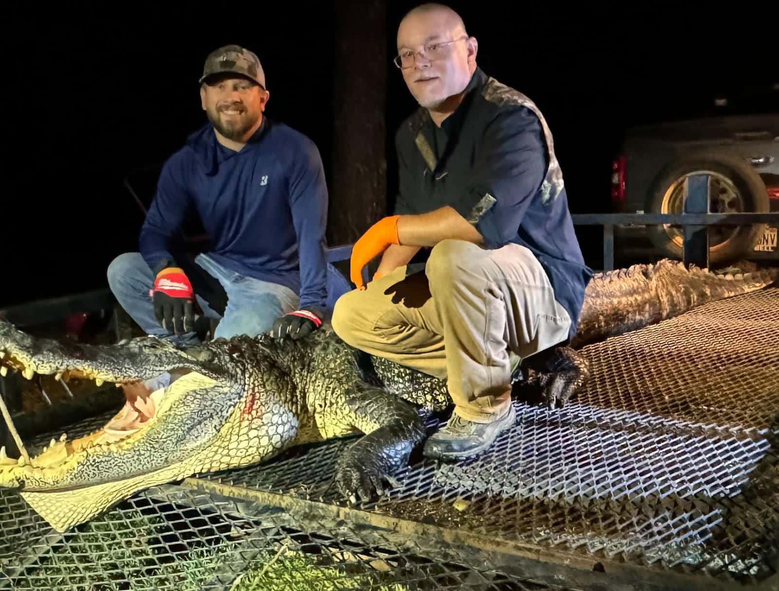 Cody Gourley and his uncle, Jason Mitchell, took the largest alligator of the 2024 hunting season, this 12-foot, 6-inch Millwood Lake monster. Photo courtesy Cody Gourley.