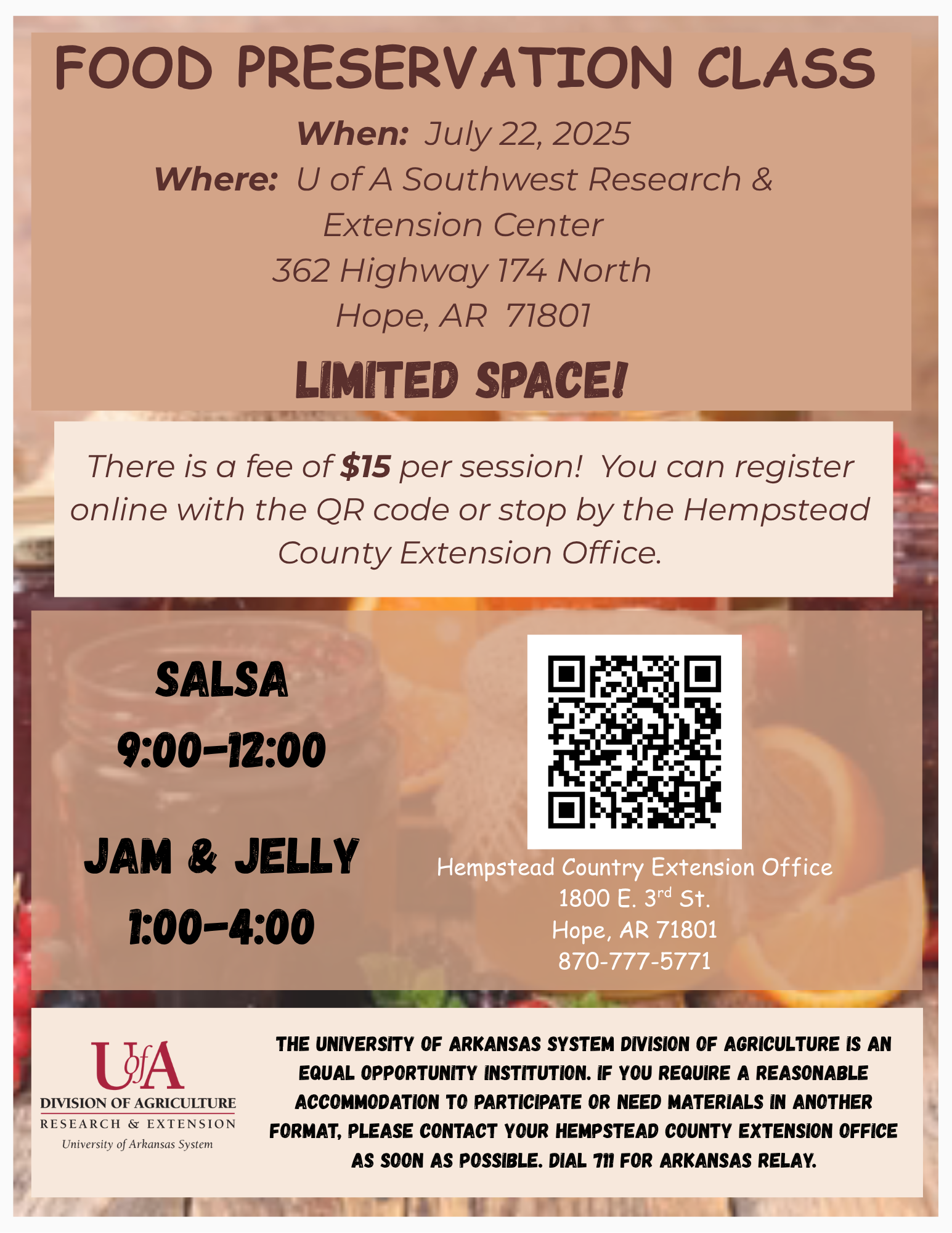 Featured Hempstead County News News Food Preservation Class July 22nd in Hope Hempstead County Cooperative Extension Service July 10, 2025