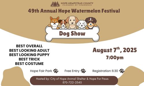 HOPE – The City of Hope Animal Shelter and Hope for Paws are excited to present the Watermelon Dog Show at this year’s 49th Annual Hope Watermelon Festival. The event will take place on Thursday, August 7th at 7:00 PM on the Southwest Arkansas Regional Medical Center Stage, with registration beginning at 6:30 PM.