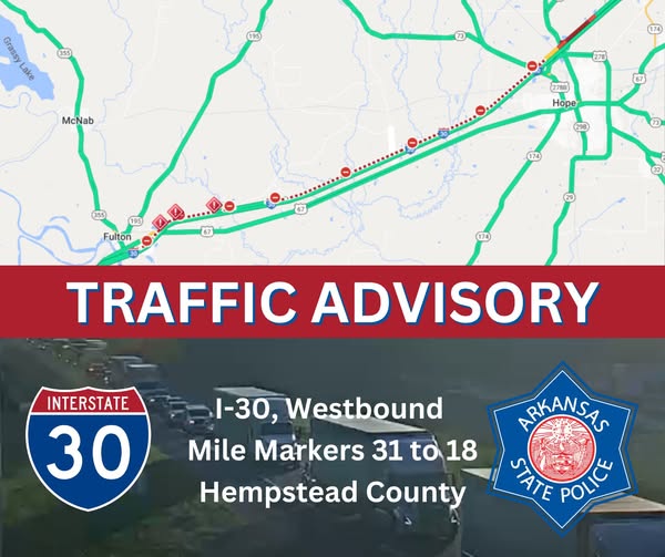 FULTON – Three wrecks have disrupted traffic on westbound Interstate 30 from Hope to Fulton. Motorists are urged to avoid that section, use U.S. 67 and expect significant delays. Westbound traffic flow will be impacted throughout the morning from mile markers 31 to 18.