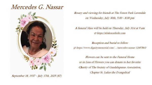 Mercedes Gonzalez Nassar passed away peacefully at her home in Houston, Texas, Thursday, July 17, 2025. Born in Ciudad Guzmán, Jalisco, Mexico, Mercedes immigrated with her family to the United States at the age of 12, courageously forging a new life with her mother, sister, and brother. She proudly became a U.S. citizen in 1967, after marrying and having 7 boys, she was deeply proud and filled deep gratitude and commitment to the country in which became her home.