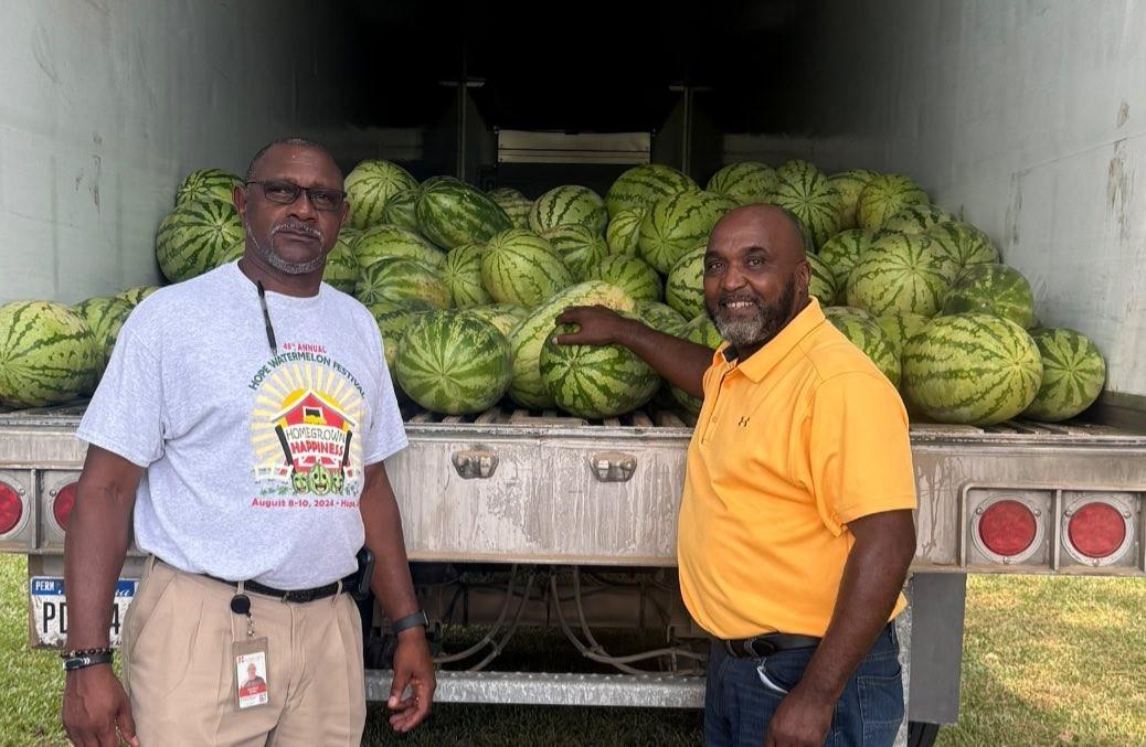The Hope Watermelon Festival has plenty of ice-cold Hope watermelon!  Maurice Henry and Nathaniel Holyfield are shown with one of the refrigerated trucks full of melons.  Ice-cold Hope watermelon by the slice will be available each day at the festival.