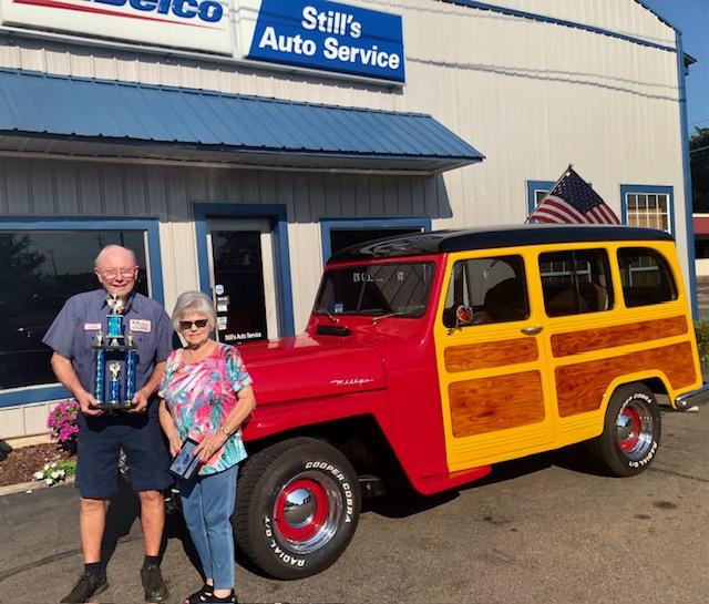 Jewell Still and his wife Brenda proudly display the awards won by their beautiful 1951 Jeep Willys entered in the Hope Civitan Car Show at the Watermelon Festival. In addition to winning first place in the “1950-1960 Truck” category, the Willys was also awarded the big “Best of Show Truck” trophy.