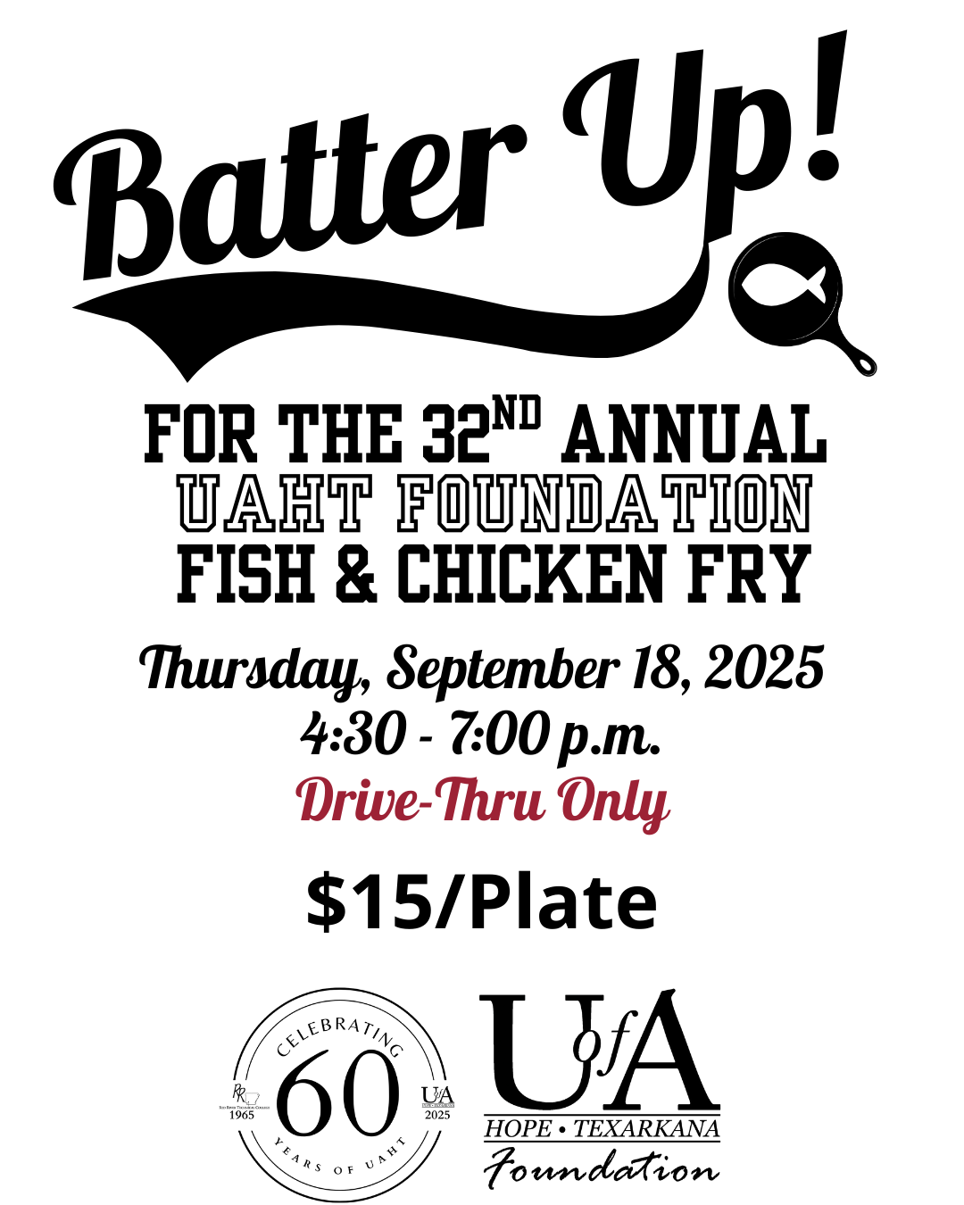 The University of Arkansas Hope-Texarkana invites you to the 32nd Annual Community Fish & Chicken Fry on Thursday, September 18, from 4:30 to 7:00 p.m. This beloved tradition continues to serve up your favorites: crispy Lions Club fried fish and juicy Tyson chicken, all from the convenience of your car.