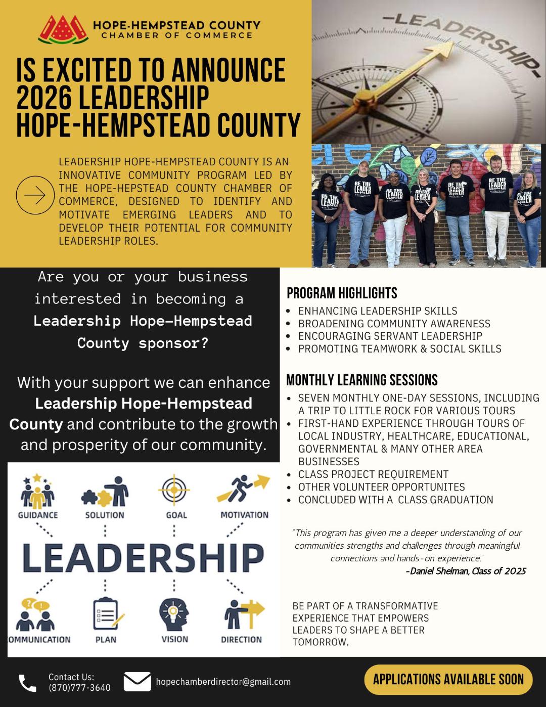HOPE – We are excited to announce that Leadership Hope-Hempstead County 2026 is on the horizon! Applications will be available soon, and we look forward to welcoming the next class of leaders into this impactful program.