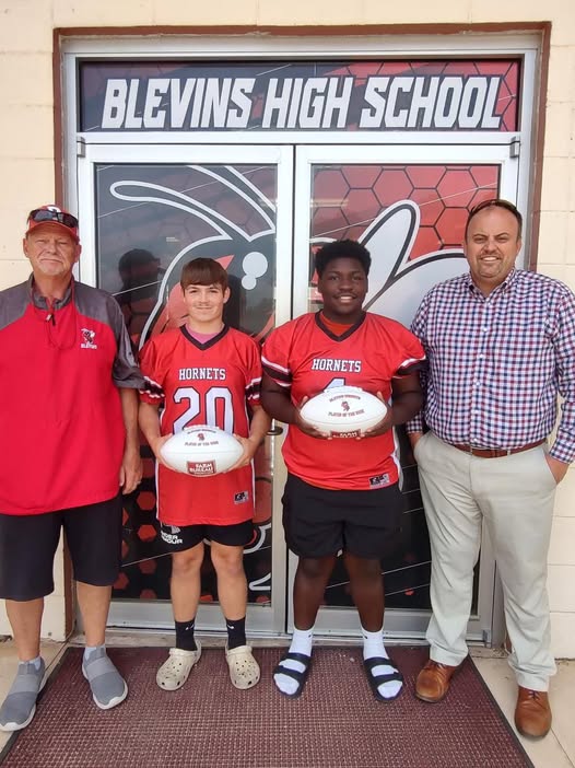 HOPE – We would like to congratulate two players from the Blevins Hornet football team for being the “Farm Bureau Player of the Week” for the last 2 weeks. Presenting the awards is Reed Camp, Agency Manager for Hempstead County Farm Bureau, and Blevins Head Coach Jerry West.