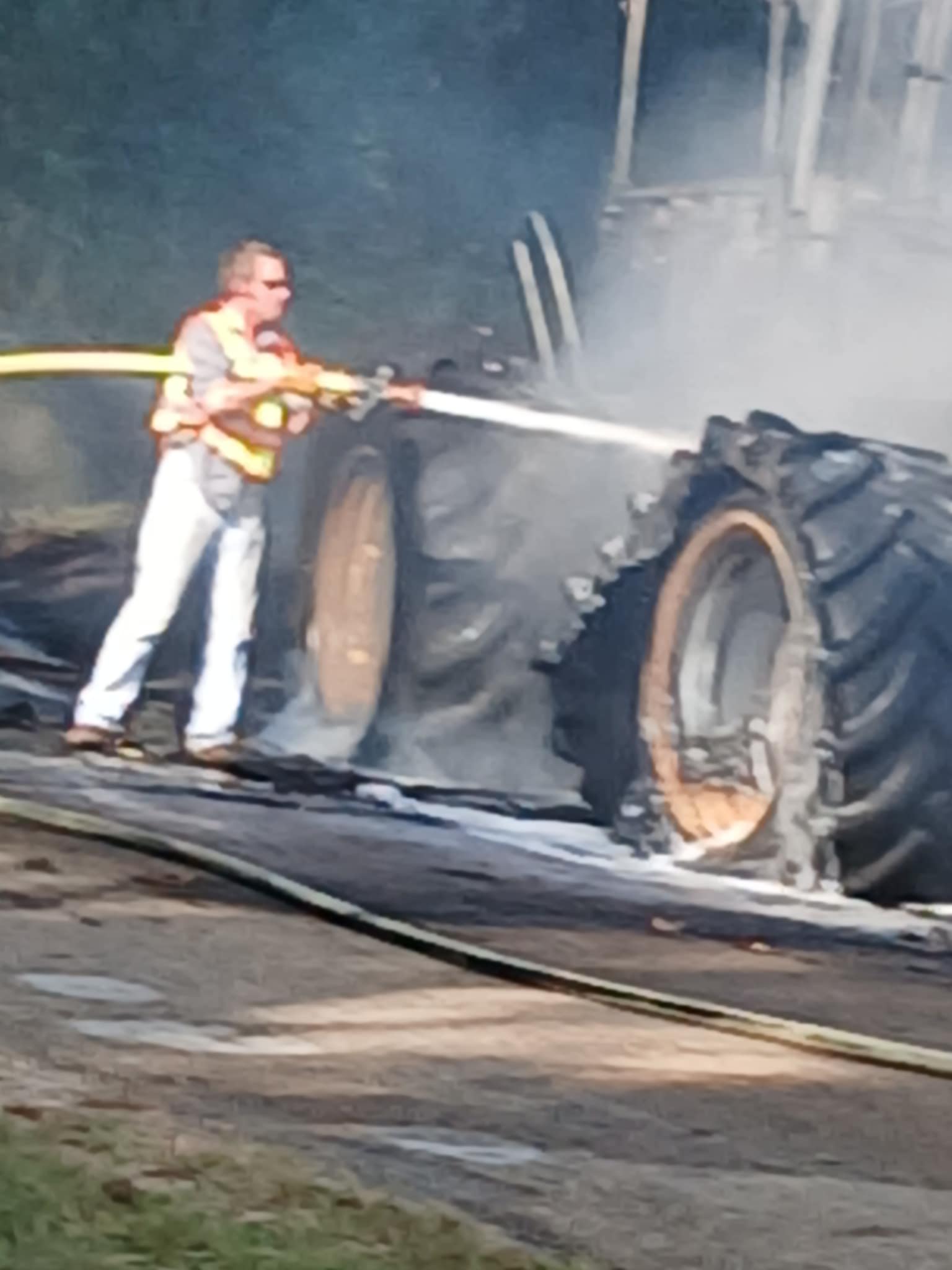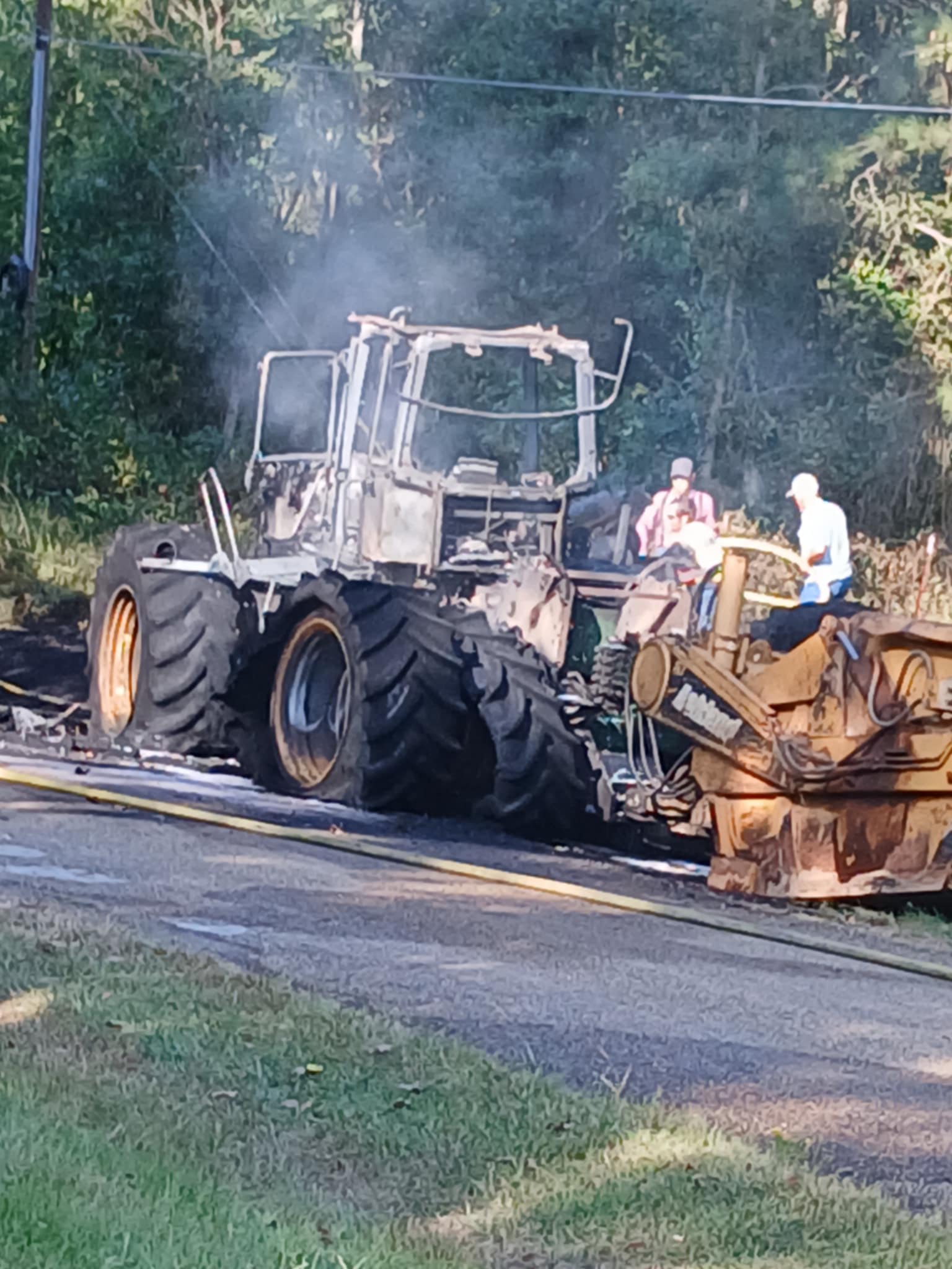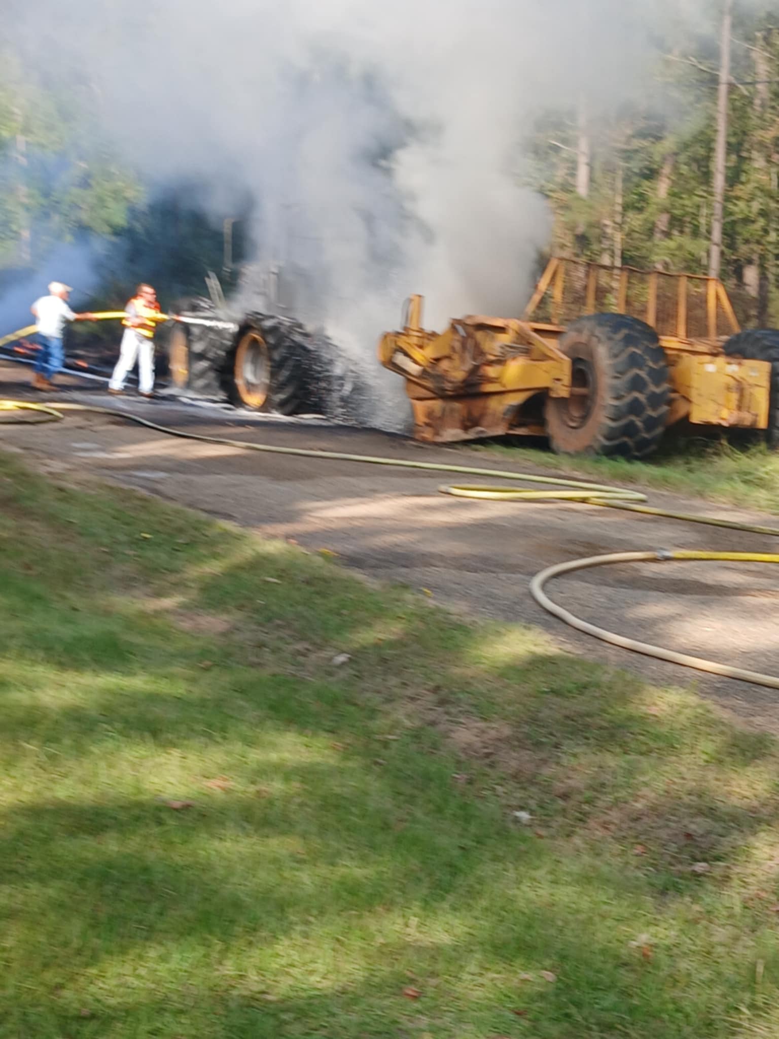 COLUMBUS – A Saturday afternoon fire on Silver Road off Highway 73 heavily damaged an articulated tractor towing a pull-behind scraper. Volunteer fire departments and personnel responded from Columbus, Saratoga, and Yancey. Photos courtesy of Jerry Hardeman-Johnson.