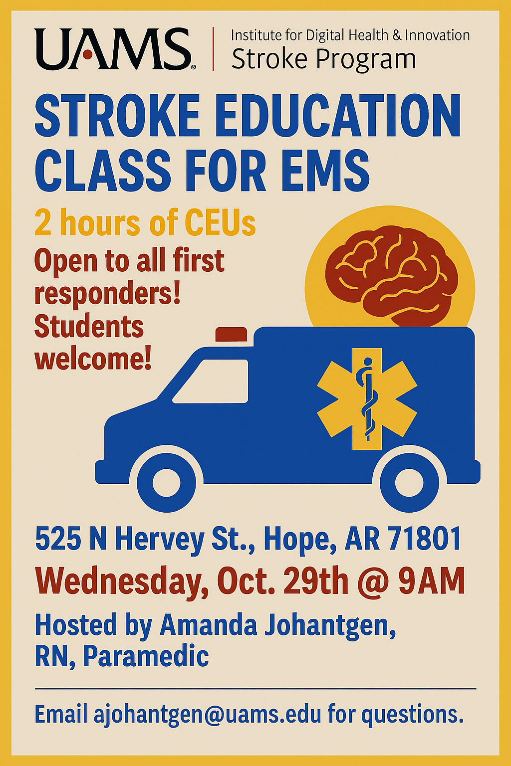 HOPE – The University of Arkansas for Medical Sciences (UAMS) Institute for Digital Health & Innovation Stroke Program, in partnership with Southwest Arkansas Regional Medical Center (SWARMC) and Pafford Medical Services, will host a Stroke Education Class for EMS on Wednesday, October 29th at 9:00 a.m. at 525 N Hervey Street in Hope, Arkansas.