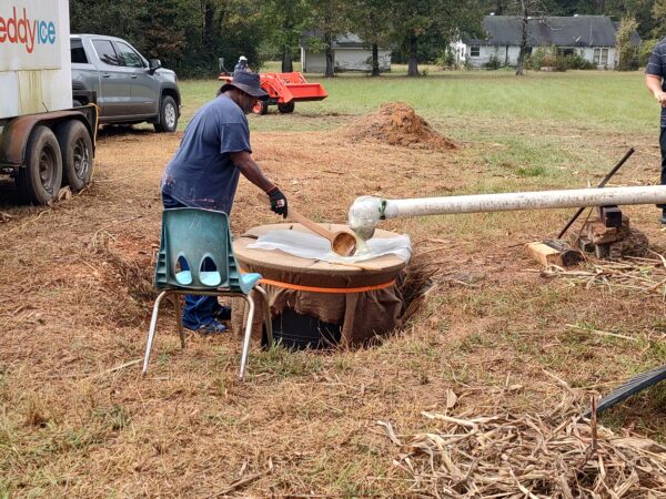 Friday (10-24) just over into Clark County near Beirne, a family got together to do something that’s been going on for nigh on to 100 years. The Hatley family had their annual sorghum syrup making. Some gather up the sorghum cane while others feed it into a motorized crusher that squeeze the juice out. It heads down into a tub where it’s filtered and flows over to a heated vat. The vat is heated by a wood fire while others continually skim the cooking juice to remove impurities. Eventually the cooked syrup is put into bottles and jars for the Hatley family to enjoy throughout the year.