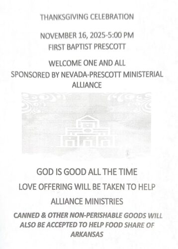 PRESCOTT – The Nevada-Prescott Ministerial Alliance met November 3rd at Prescott United Methodist Church; The group finalized the plans for the upcoming Thanksgiving Celebration that will be held at First Baptist Church in Prescott. The group meets the first Monday of each month, with the exception of December, the meeting will be on the 8th. This meeting is open to all clergy and lay members.