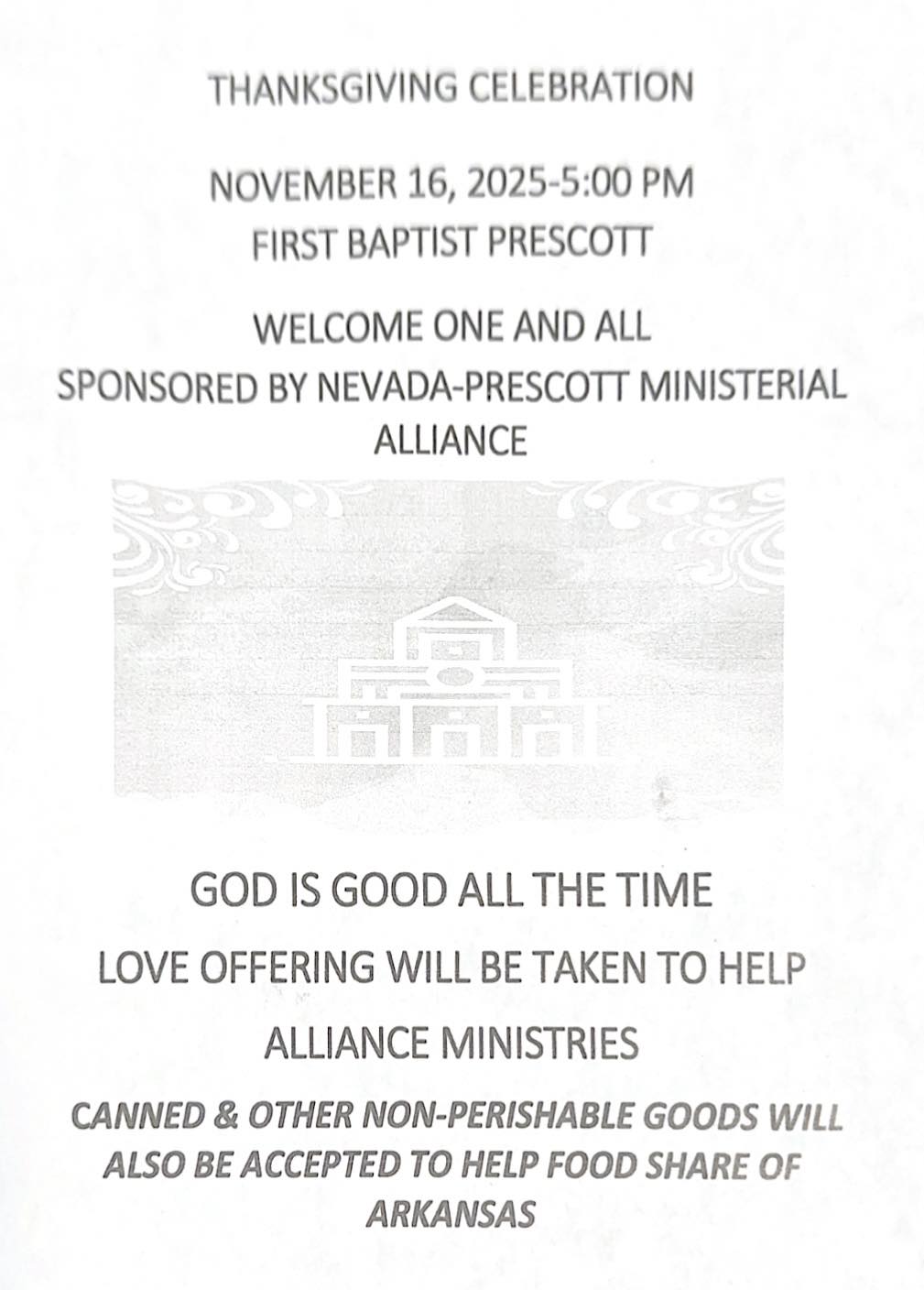 PRESCOTT – The Nevada-Prescott Ministerial Alliance met November 3rd at Prescott United Methodist Church; The group finalized the plans for the upcoming Thanksgiving Celebration that will be held at First Baptist Church in Prescott. The group meets the first Monday of each month, with the exception of December, the meeting will be on the 8th. This meeting is open to all clergy and lay members.