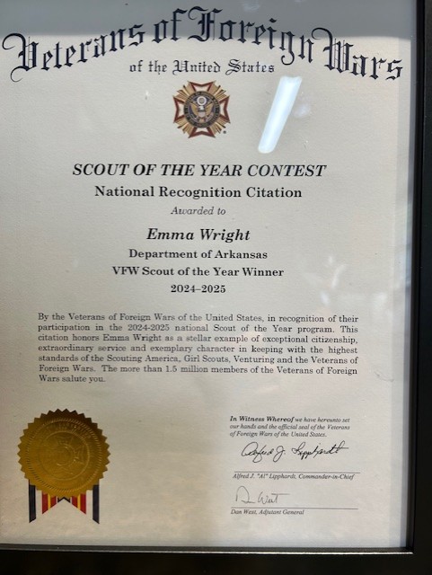 HOPE — Emma Wright, a student from Hope, has been awarded the prestigious title of VFW Scout of the Year for the state of Arkansas for 2024–2025, earning a $500 scholarship from Hot Springs VFW Post 2278. Wright was selected from more than 200 candidates across the state and is notably the first female Eagle Scout in Arkansas to receive this honor.