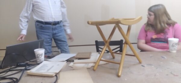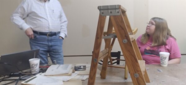 John King was present to discuss his family’s business, Southwest Wood Products, which was based in Hope. Mr. King said two-foot stepladders were sold by the boxcar load. The business was started by Frank King, John King’s father. John King discussed how the ladders were made. Mr. King handed out relief cards of ladders that his father had made patterns for. Joseph Barry photo