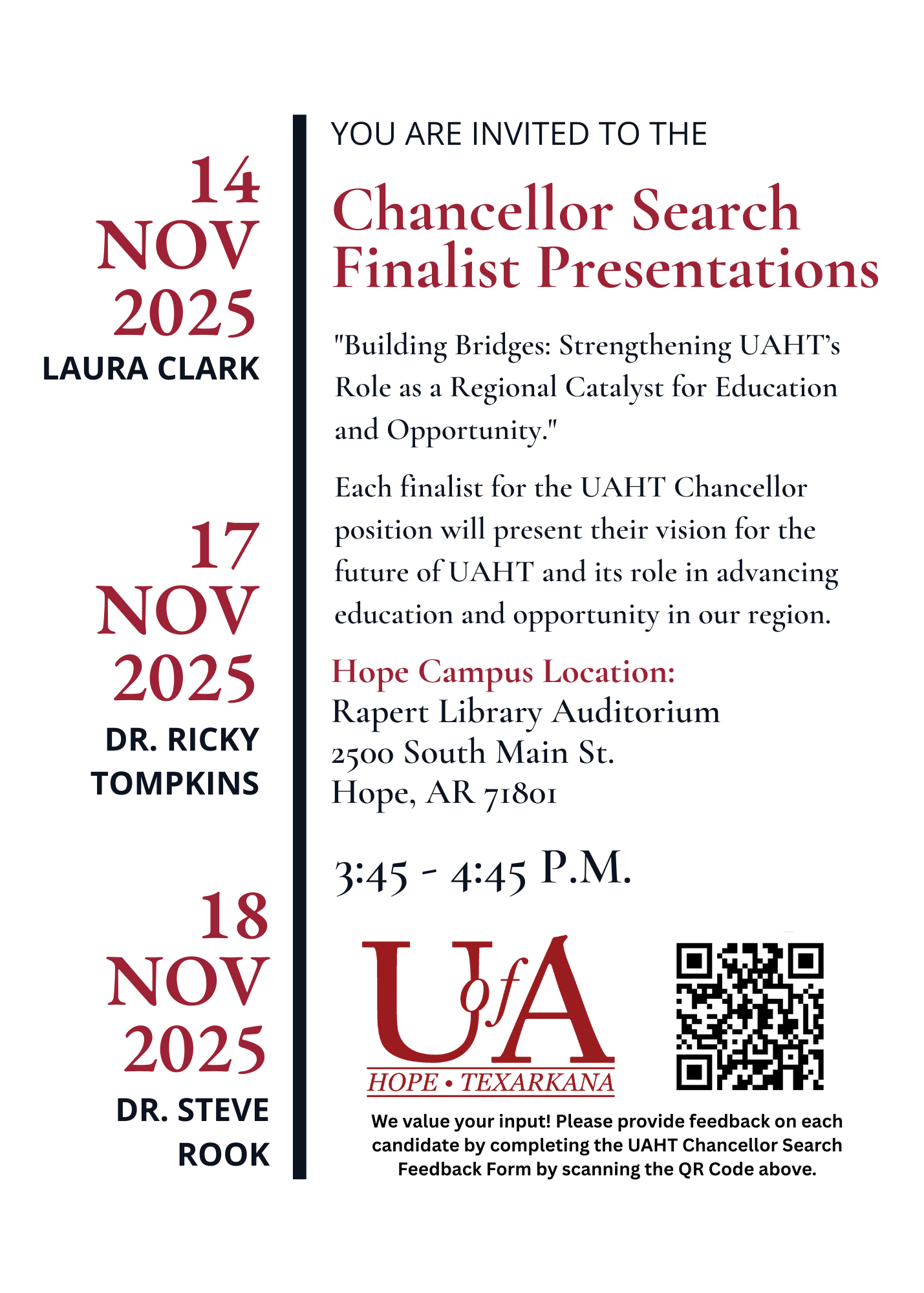 HOPE – The University of Arkansas Hope-Texarkana (UAHT) invites community partners, faculty, staff, students, and the public to attend finalist presentations for the position of UAHT Chancellor. Themed “Building Bridges: Strengthening UAHT’s Role as a […]