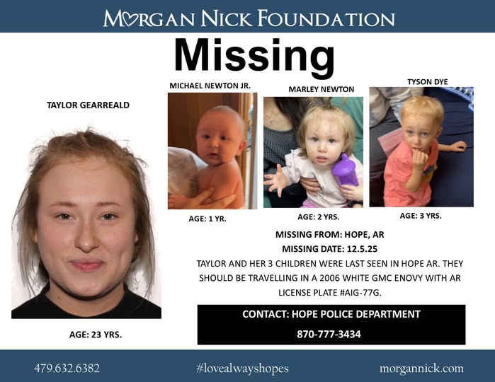 HOPE – Taylor and her children are missing out of Hope AR as of 12/5/2025. They were last known to be traveling in a 2006 white GMC Envoy AR license plate #AIG-77G. If you have any information regarding their whereabouts please call Hope PD at 870-777-3434.