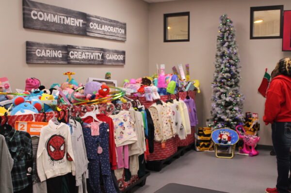 HOPE – Staff members from Making Rainbows of Rainbow of Challenges (ROCOH) and Tyson Foods of Hope are pictured with a mountain of donated toys, clothes, blankets, coats, and toiletries.
