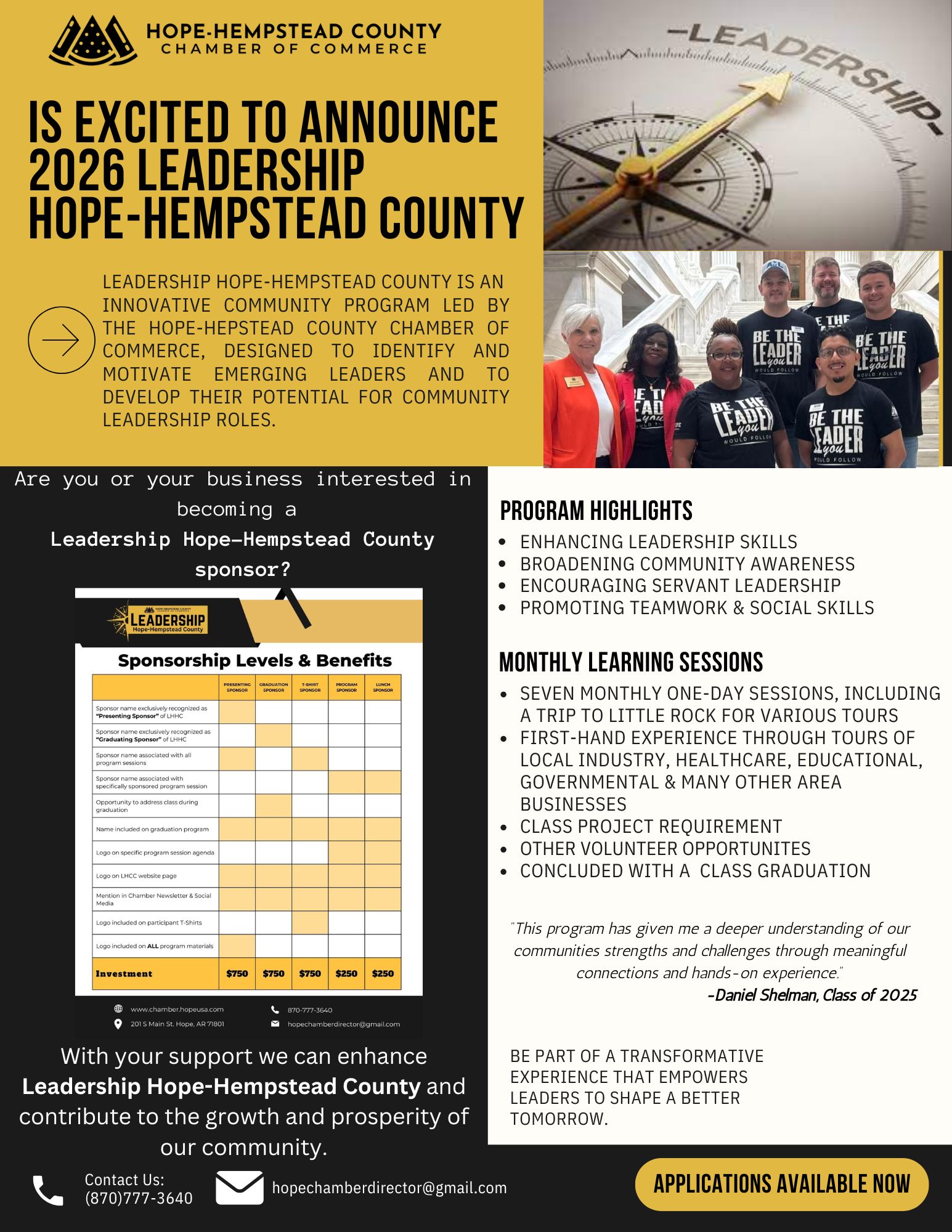 This is your last call for Leadership Hope-Hempstead County 2026 applications! If you’ve been thinking about applying, now is the perfect time. Don’t miss your chance to be part of this incredible leadership experience that connects, equips, and inspires community leaders.