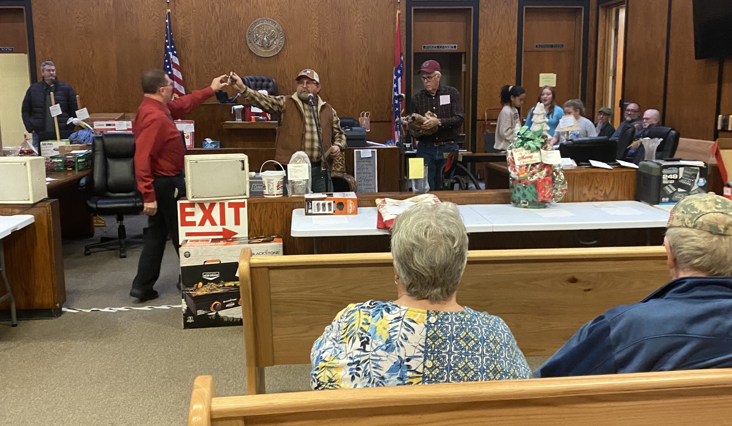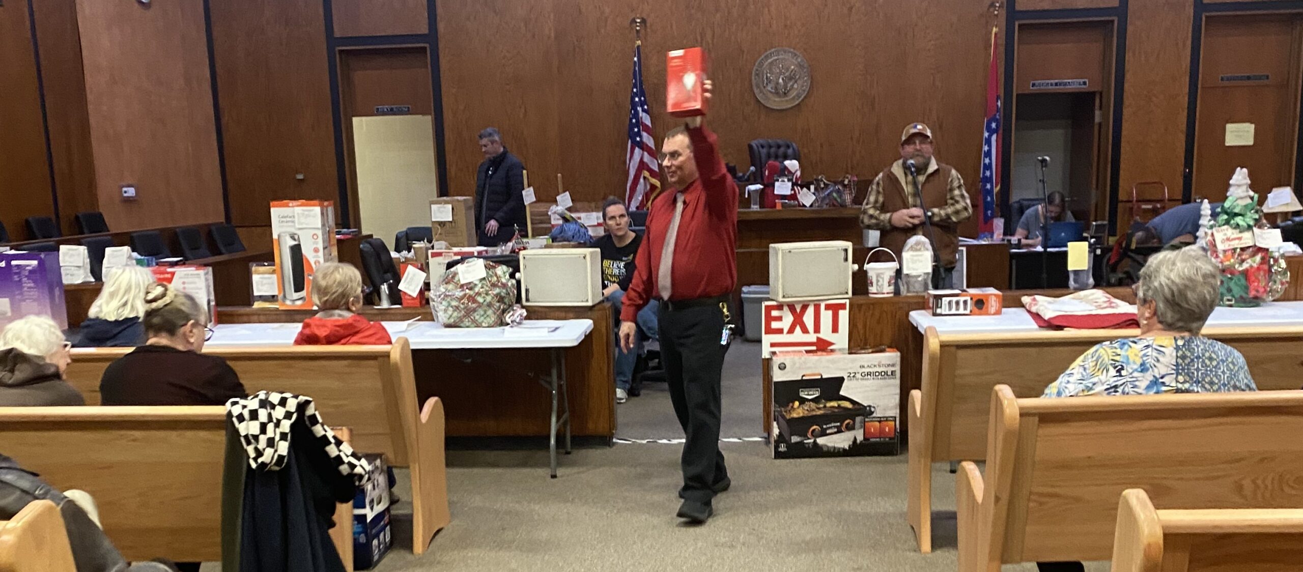 The Prescott Civic Coalition held the first night of its Christmas Auction Friday (12-12) at the Nevada County Courthouse. The auction is being held to raise funds to provide food for needy Nevada County families during the holidays. The auction will continue Saturday (12-13) at the courthouse starting at 6pm and the public is invited. The auction is similar to the Christmas Auction held for many years by the Prescott Lions. The Lions are part of the civic coalition as are the Prescott Kiwans Club and Prescott Rotary.