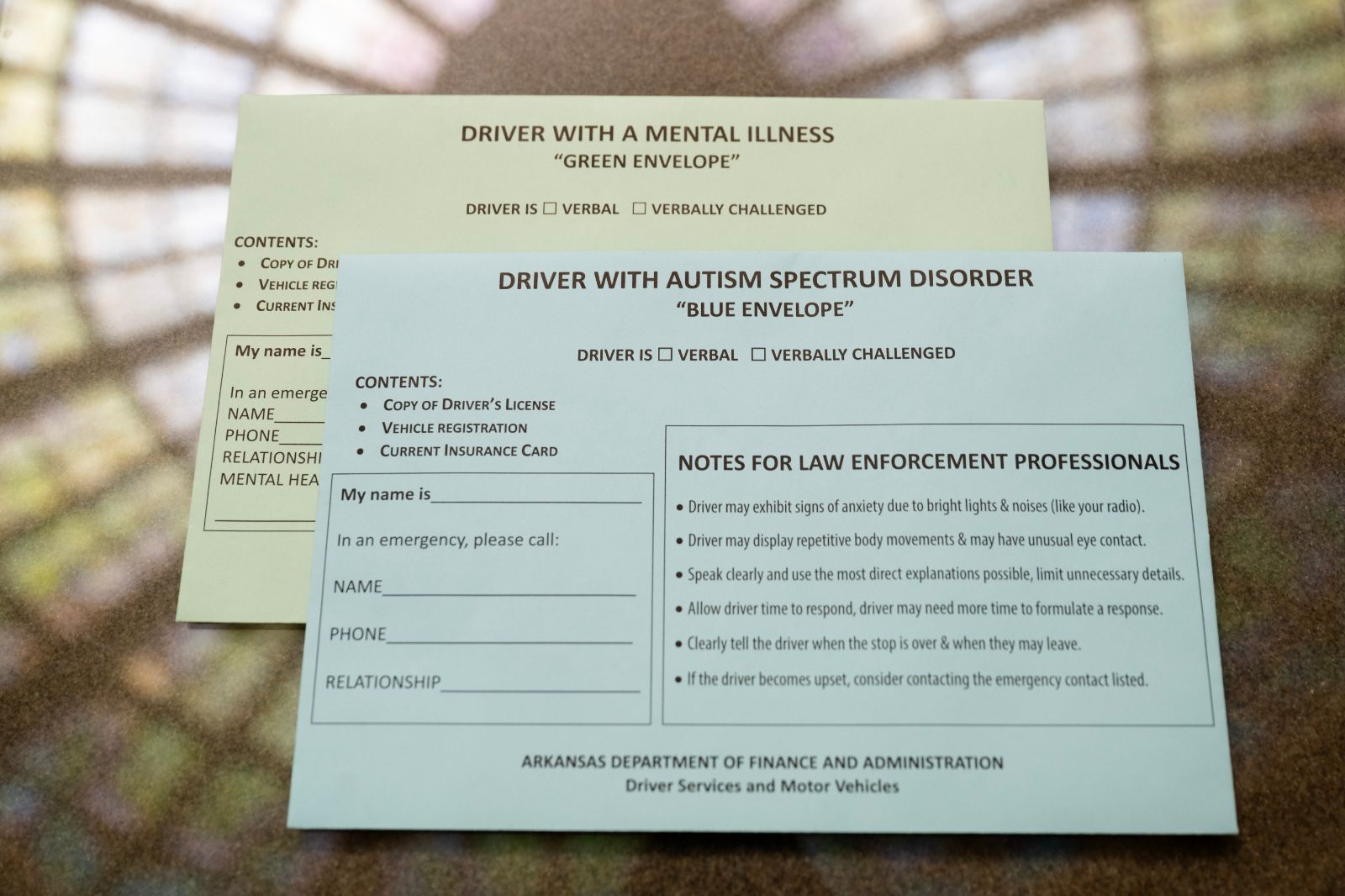 Beginning January 2, Arkansas drivers will have access to two new programs designed to make traffic stops safer, calmer, and more effective for individuals with mental illness or autism. The Green Envelope Program and the Blue Envelope Program, both passed during the 2025 Regular Session of the Arkansas General Assembly, focus on improving communication between drivers and law enforcement during motor vehicle interactions.