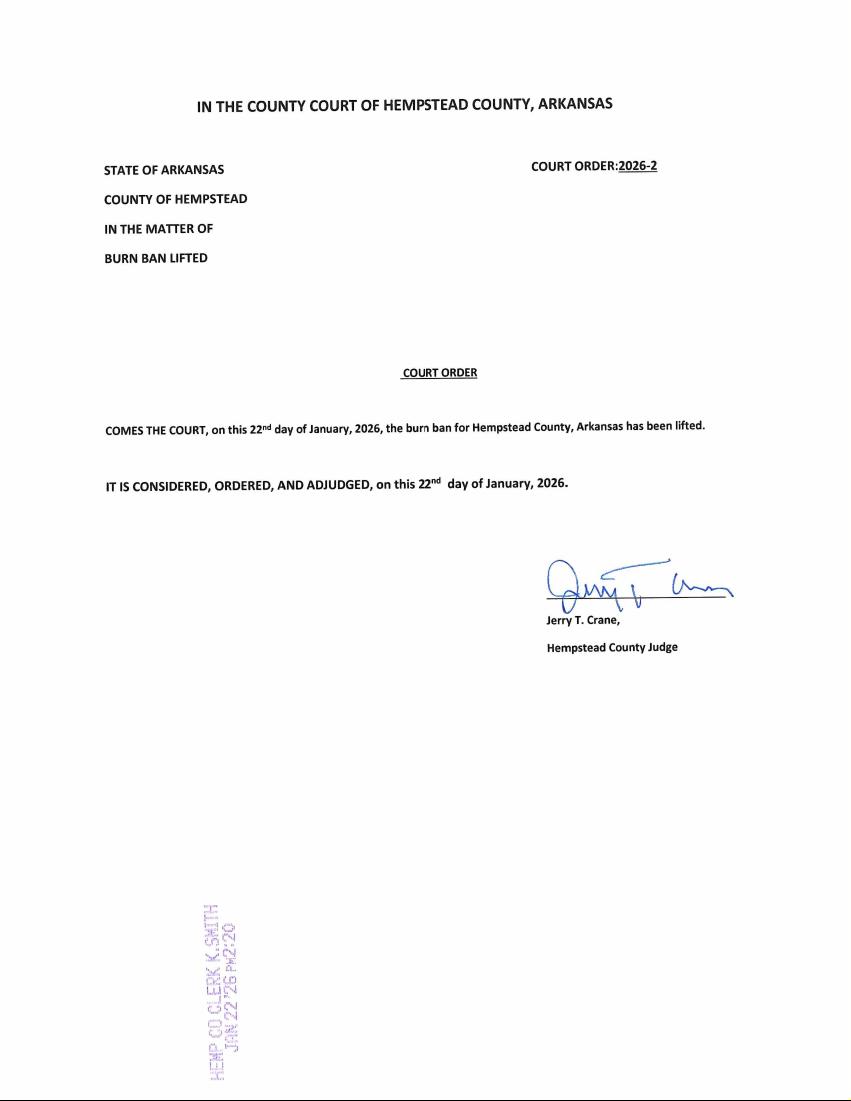 Featured Hempstead County News News Hempstead County Burn Ban lifted Judge Jerry Crane January 22, 2026