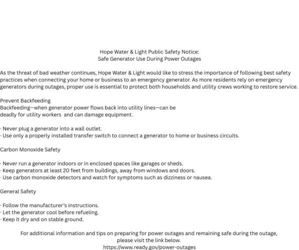 HOPE – Hope Water & Light is posting this PUBLIC SAFETY NOTICE regarding the best practices for using emergency generators during power outages. Please see below. In addition, and for more information and tips on preparing for power outages and remaining safe during the outage, please visit this link https://www.ready.gov/power-outages