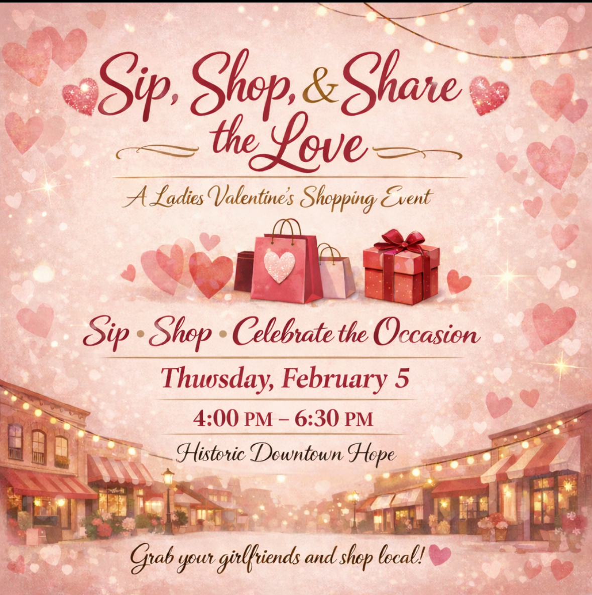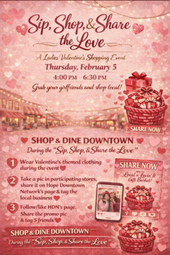 HOPE – Hope Downtown Network (HDN) has planned an event that is directly aimed at supporting downtown retail businesses as well as restaurants and eateries. HDN is inviting ladies to gather their girlfriends and celebrate Valentine’s season with a fun-filled evening of shopping, dining, and community connection during “Sip, Shop, & Share the Love” in Historic Downtown Hope.