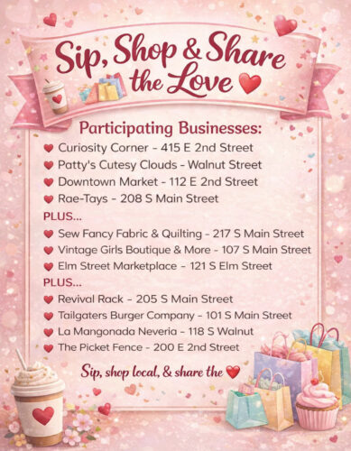 Beckie Moore, director of Hope Downtown Network, stated, “Sip, Shop, & Share the Love” couldn’t come at a better time for our downtown businesses. The snow and ice caused us to press pause on doing business and resulted in losses for many of our downtown businesses. This event will offer a time to get out of the house and show some love to our amazing small businesses in downtown Hope.”