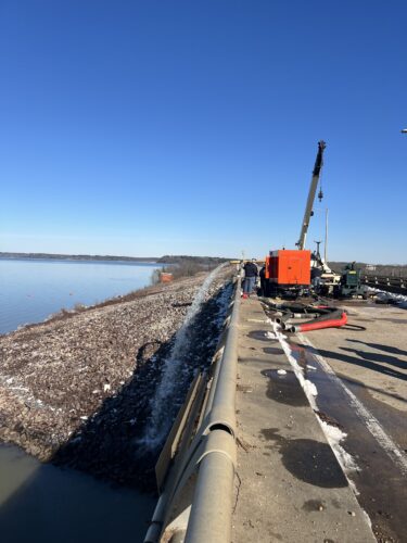 Maintenance crews identified an unexpected issue inside the Millwood Dam inspection gallery that required immediate pumping operations to ensure safe working conditions. The sump pumps inside the dam had gone offline because of the weather conditions, allowing water to accumulate in the gallery. Additional pumps were brought in to remove the water, and once levels were lowered, USACE crews were able to restore the dam’s sump pumps to normal operation.