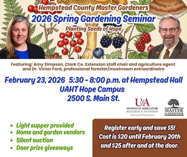 HOPE – We are finally thawing and everyone’s ready for spring! Come join our Master Gardeners for their annual spring seminar Monday, Feb. 23rd at Hempstead Hall. Registration begins at 5:30 pm, but you can come a little early and shop with our home and garden vendors while you wait for the program to start at 6 pm. Amy Simpson, Clark County Extension agent, will give you great tips and tricks to get your gardens ready for spring, and Dr. Vic Ford, a local favorite, will talk on growing your own mushrooms.