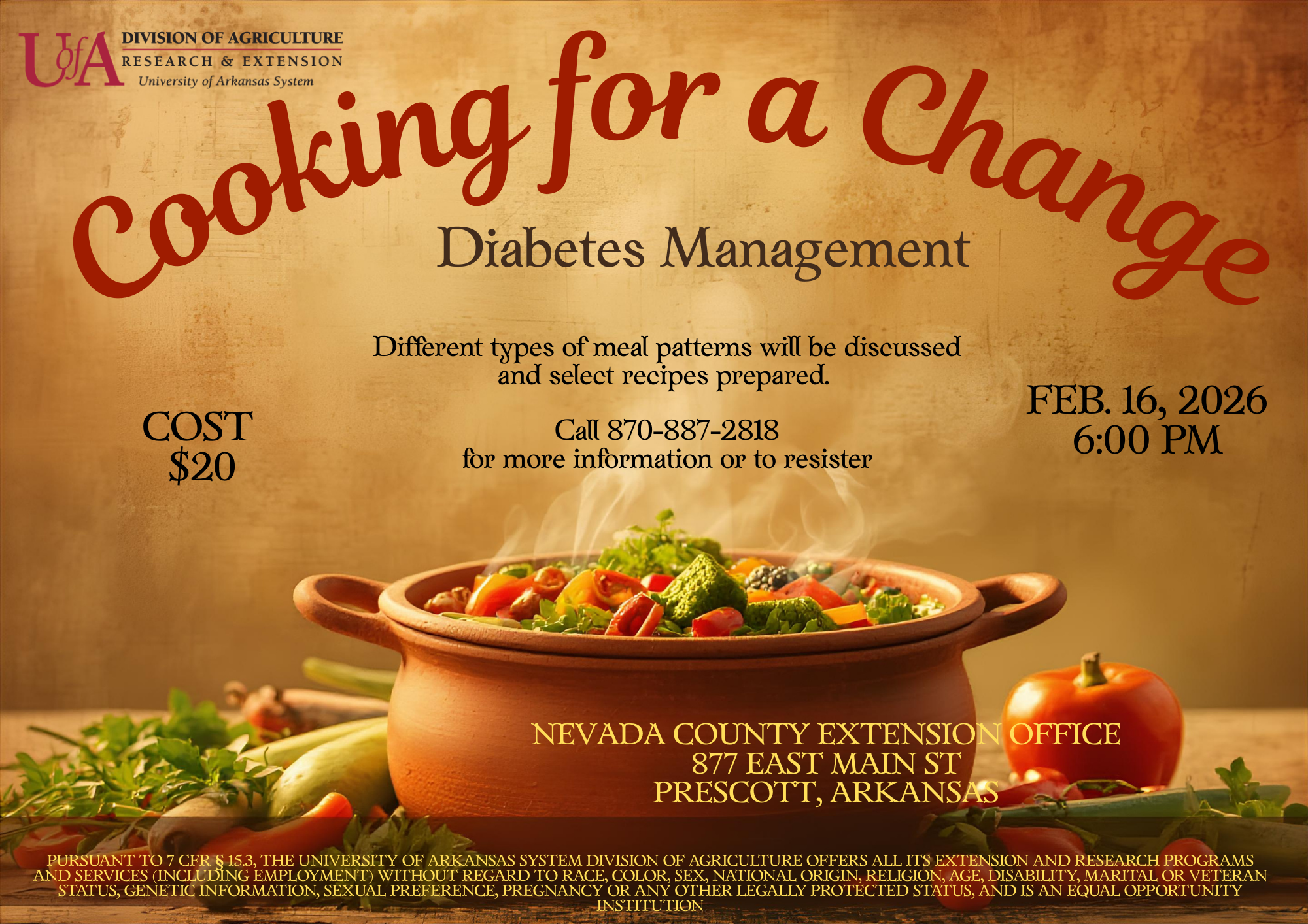 PRESCOTT – Nevada County Extension, The Nevada County Extension part of the University Division of Agriculture Research and Cooperative Extension, today announced its upcoming “Cooking for a Change” workshop. This hands-on cooking workshop’s goal is to introduce ways to bring positive changes in health, finances and family time. The event is scheduled for February 16th at 6:00 pm at the Nevada County Extension Office in Prescott.