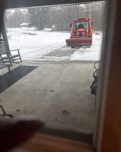 PRESCOTT – Pictured is a workman with his equipment, clearing ice off the driveway of Hatley House in Prescott. The Hatley staff reported the heavy equipment is usually brought into clear places such as nursing homes and other critical spots in Prescott and now they have added Hatley House, providing safe footing for our individuals getting out to shop for groceries, or trips to the variety of stops in Prescott.