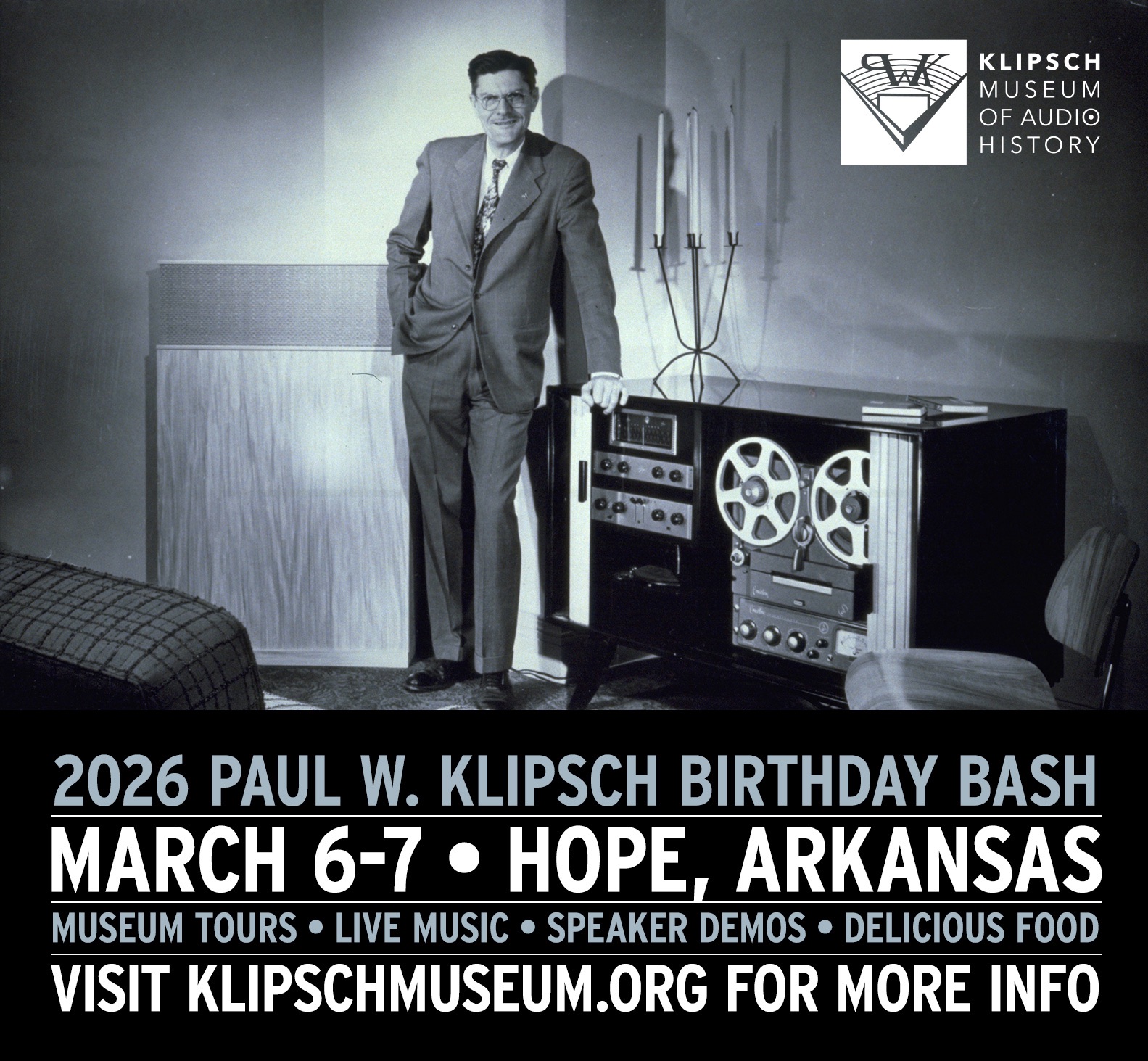 HOPE – Join the Klipsch Museum of Audio History on March 6 – 7, 2026, in Hope, AR, for the Paul W. Klipsch (PWK) Birthday Bash Spring fund raising event. This year the Museum celebrates 80 years of the Hope Klipsch Factory producing the world-renowned Klipschorn loudspeaker and ten years since the Museum formed as a non-profit organization.