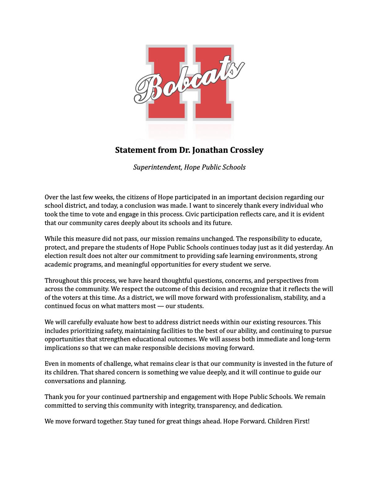 Featured Hempstead County News News Hope Superintendent Crossley issues statement after bond issue fails Dr. Jonathan Crosley March 5, 2026