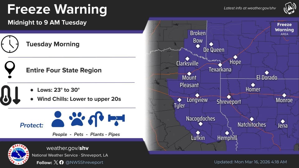 Featured Featured Hempstead County News Nevada County News News Regional News Weather Freeze Warning in effect tonight National Weather Service-Shreveport March 16, 2026