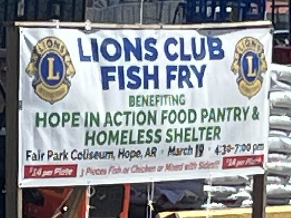 The Hope Lions Club will hold a fish fry to benefit the Hope in Action Food Pantry and Homeless Shelter Thursday March 19th from 4:30pm to 7pm at the Fair Park Coliseum. The cost is $14 per plate and includes 3 pieces of fish or chicken with sides. Serving will be 4:30pm to 7pm and there will also be a dessert auction. All proceeds benefit Hope in Action. The public is invited. Tickets will be available at the door.