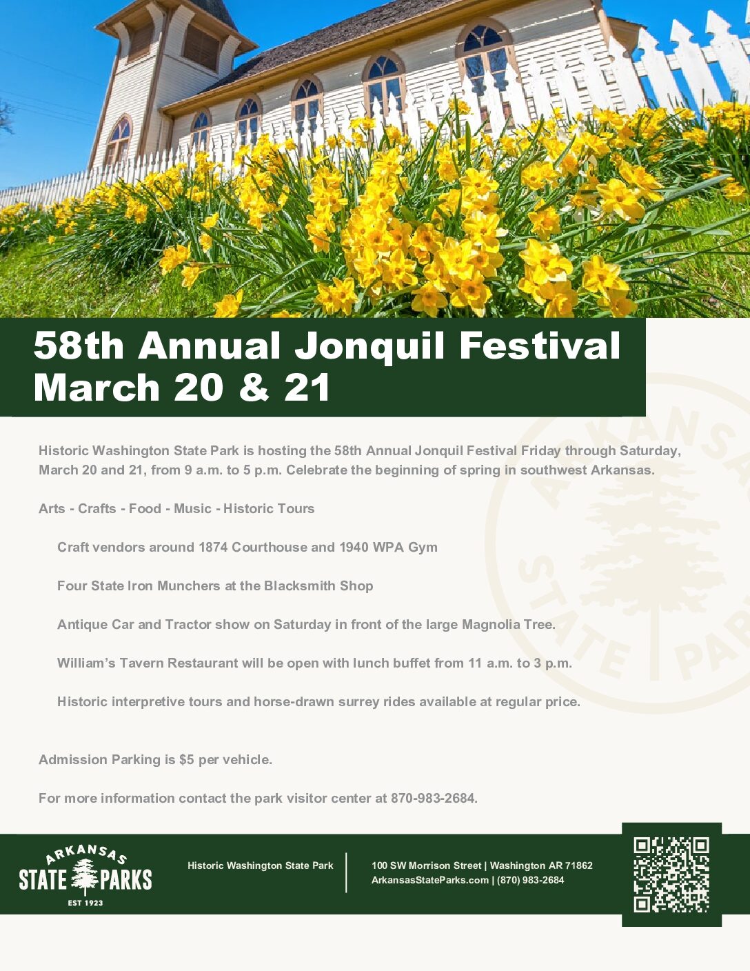 (WASHINGTON, Ark.) – Historic Washington State Park is hosting the 58th Annual Jonquil Festival Friday through Saturday, March 20 and 21, from 9 a.m. to 5 p.m. Thousands of jonquils will welcome visitors to the festival. There will also be craftspeople, entertainers, activities and a variety of food.